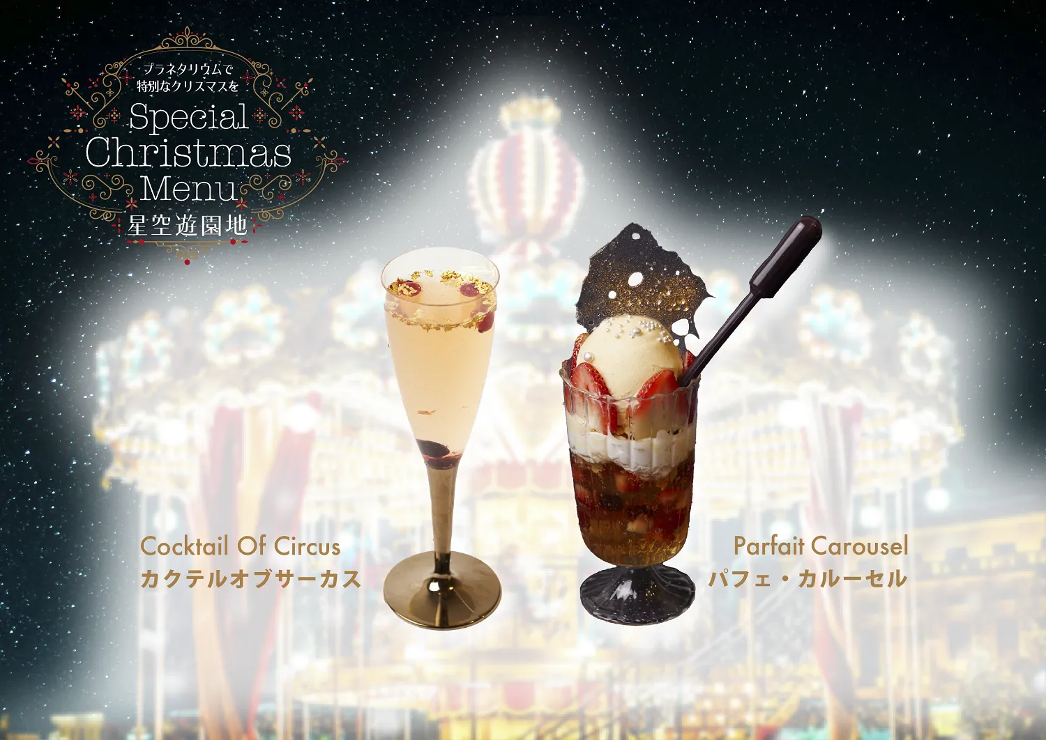 星空遊園地に扮したプラネタリウムで、1年で1番輝く賑やかなクリスマスをお楽しみください。