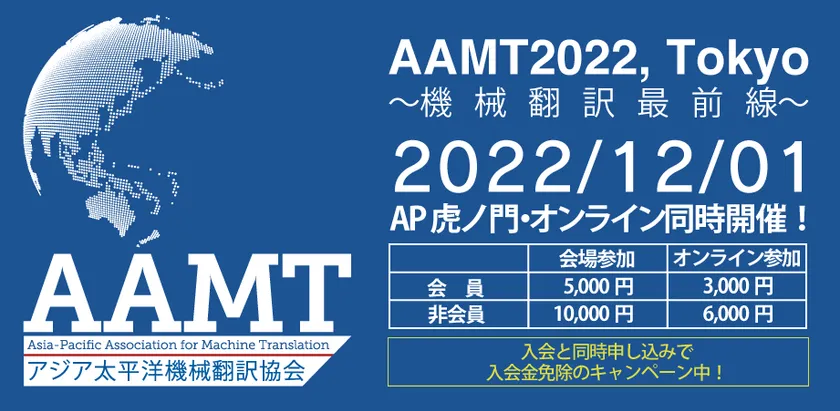 機械翻訳の普及・改良を目的として、機械翻訳に関する情報発信やステークホルダー間の情報交換を行っている一般社団法人アジア太平洋機械翻訳協会(1991年創立、所在地:京都府相楽郡、会長:隅田 英一郎、以下、AAMT)は、2022年も年次大会を開催いたします。今回の年次大会は都内会場での開催に加えオンラインでも同時配信を行う、ハイブリッド方式での開催となります。年次大会「AAMT2022,Tokyo~機械翻訳最前線~」では、2021年と同様に急速に発展している機械翻訳に関連した最新情報を発信いたします。