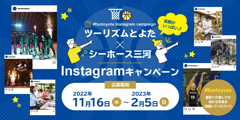このキャンペーンでは、2022年11月19日(土)・20日(日)、2023年1月28日(土)・29日(日)にスカイホール豊田で開催されるシーホース三河のホームゲームに合わせ、豊田市の楽しさ(観光スポット、グルメ、体験など)が伝わる写真をInstagramで募集します。「楽しさ」、「驚き」、「感動」など幅広いテーマで、ハッシュタグ「#funtoyota」を付けて投稿していただきます。豊田市の四季折々の楽しさを伝える写真やシーホース三河のスカイホール豊田でのホームゲームを応援している姿や選手たちの迫力プレーなど2022年4月以降に撮影された写真が対象です。