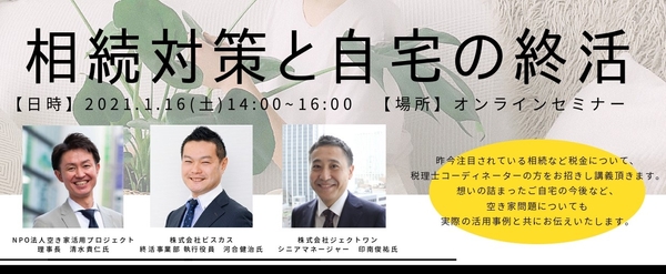 空き家活用サービス『アキサポ』を展開する株式会社ジェクトワン(本社:東京都渋谷区、代表取締役:大河幹男 以下、ジェクトワン)は、行政や自治体との連携をはじめ、空き家所有者と利用者の橋渡しを担うNPO法人空き家活用プロジェクトが主催する『相続対策と自宅の終活セミナー』に参加いたします。