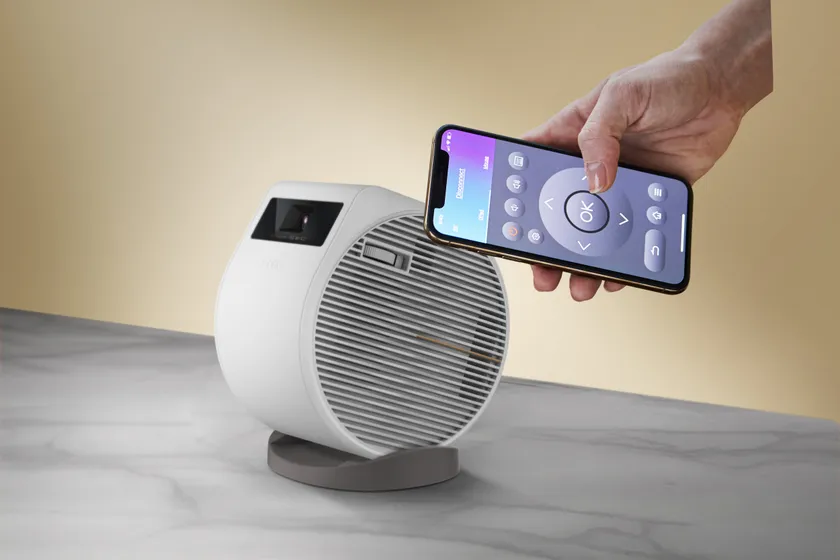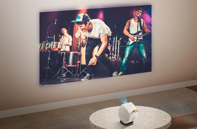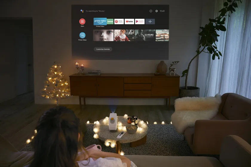 2021年10月に発売したGV30の最大の特徴である天井投影機能をそのままに、ポータビリティ性を向上させたコンパクトな設計が特長となっています。また、Android TV 10のドングルが付属し、自動縦台形補正機能(40度)も備えているため、ストレスフリーでさまざまなエンターテインメントを楽しむことができます。