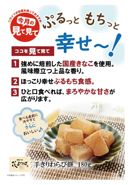 ライフオリジナルの和菓子ブランドである「花よつば」の商品をさらに多くのお客様に知っていただきたく、夏場に最盛期を迎える「わらび餅」に注目し、新商品を開発いたしました。「花よつば」の看板商品になるよう、ライフらしさを追求し味や品質にこだわりました。6月は特別価格でご提供し、お客様に価格でもご満足いただける商品が完成したので、ぜひお試しください!