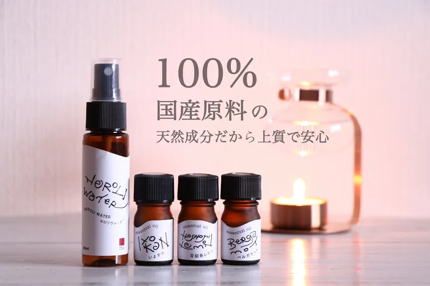 国産原材料のみの精油は香り市場では希少で、量も限られます。柑橘栽培50年以上、ジュースはあの豪華列車「ななつ星」に採用されるほどの高品質な柑橘を栽培する農家佐賀県「田島柑橘園&加工所」。ネロリは、春先のわずか数週間しか咲かない耕作放棄農園の橙の花を摘み取ってすぐに使用。水蒸気蒸留から作る精油とネロリウォーターです。