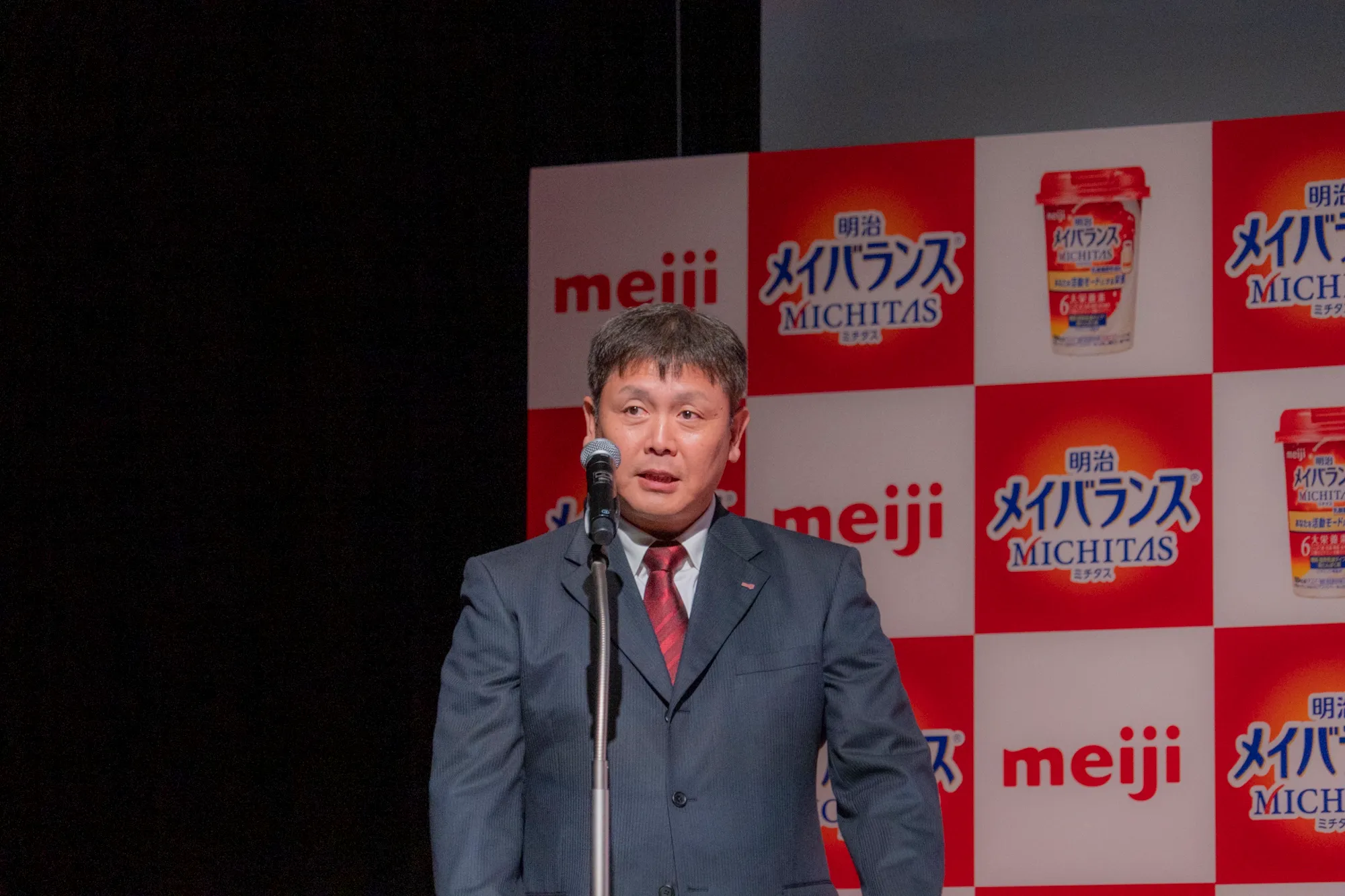 はじめに株式会社明治・グローバルニュートリション事業本部メディカルマーケティング部長の荻原が、新ブランド『明治メイバランスMICHITAS(ミチタス)』の商品特長について、既存ブランドである『明治メイバランス』の説明や、日本の健康寿命、健康ニーズの調査データを交えながら紹介しました。日本の平均寿命は延びつづけ、「人生100年時代」も当たり前の時代になってきており、“いつまでも健康でいたい”という意識は高まっているという考えを述べます。健康に関する関心領域の1位は「食事・食生活」となっているものの、半数以上の人は栄養バランスのとれた食生活が毎日できているわけではないという実態を説明。そこでご提案するのが、『明治メイバランスMICHITAS』だと続けます。ブランドについて「日々の食生活にプラスすることで、たんぱく質、脂質、糖質、食物繊維、ビタミン、ミネラルの6大栄養素をバランスよく摂ることができます」と解説。「第一弾商品として、『明治メイバランスMICHITASカップ』ドリンクタイプの3種類を発売いたします。味の種類は、乳酸菌飲料風味、白桃風味、ブルーベリー風味の3種。“いつも健康で輝いていたい大人のためのトータルバランス飲料”として設計されております。たんぱく質は、同量の普通牛乳の約2倍、食物繊維はレタス約4分の3個分、ビタミン、ミネラルは合わせて20種類を摂るこができます。エネルギーは、100kcalとなっておりますので、カロリーコントロールをしている方にもおすすめです」と商品の特長を説明。『明治メイバランス』については、「医療現場で四半世紀に渡り支持されているブランドになります。病院・高齢者施設における経口栄養流動食ではシェアNo.1の商品ブランドです。病気や加齢により食事が十分に摂れない方へ、少量で高エネルギーでありながら、からだに必要な栄養素をバランス良く摂れるよう設計された商品として、様々な場面で、多くの皆様に選ばれております」と紹介しました。そうした医療現場での知見を活かし、作られた『明治メイバランスMICHITAS』。「カラダもココロも満ちた明日へ手軽で本格的なトータルバランス飲料『明治メイバランス MICHITASカップ』は“いつまでも健康でいたい”という願いを応援いたします」と、説明を締めくくりました。