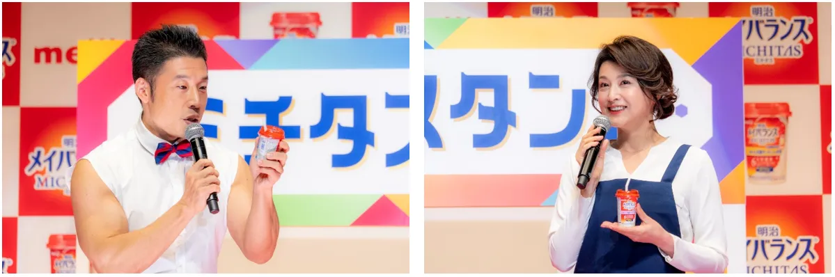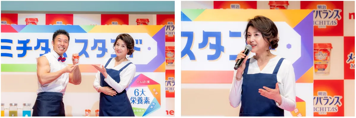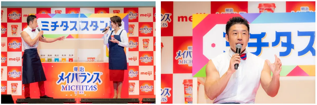 ステージに用意されているのは、明治メイバランスミチタスカップが、“栄養がバランスよく摂れる”ことと、“ジュースのようにおいしく飲める”ことを表現するため、ジューススタンドを模したセット、その名も『ミチタススタンド』。その店員として、カラダとココロの前向きさを体現している藤原紀香さんとなかやまきんに君さんが、エプロン姿で登場しました。ジューススタンドのセットや衣装について藤原さんは「ブランドカラーを意識しつつ、元気になる朱赤、集中力の紺色、視覚から自分をリセットしてくれる白、そんなイメージでやってきました」と説明しました。白Tシャツに蝶ネクタイといういつもと違った衣装や筋肉美をMCから褒められたきんに君さんは「私の衣装は、長袖の袖部分を切りまして、腕の筋肉を見せやすいようなデザインになっております」と嬉しそうに答えました。実は、今回が初共演というお二人。お互いの印象について、きんに君さんは「まず、紀香さんの姿勢の良さ、カッコよさが目に入ってきました。僕はボディービルという競技をやっておりますので、その方のスタイルに目が行くわけです。紀香さんは手足も長いし姿勢も良いし、ボディービルのようなトレーニングをされたら大会でもご活躍されると思います」、藤原さんは「きんに君さんは私以上に姿勢が良いです。年齢を重ねてくると猫背になりがちだと思うんですけど、きんに君さんは背中の肩甲骨がすごく綺麗なんだろうなと分かります。ヒップもキュッと上がり、普段から運動や食にも気をつけているんだろうなと思いました」と、にこやかに語りました。