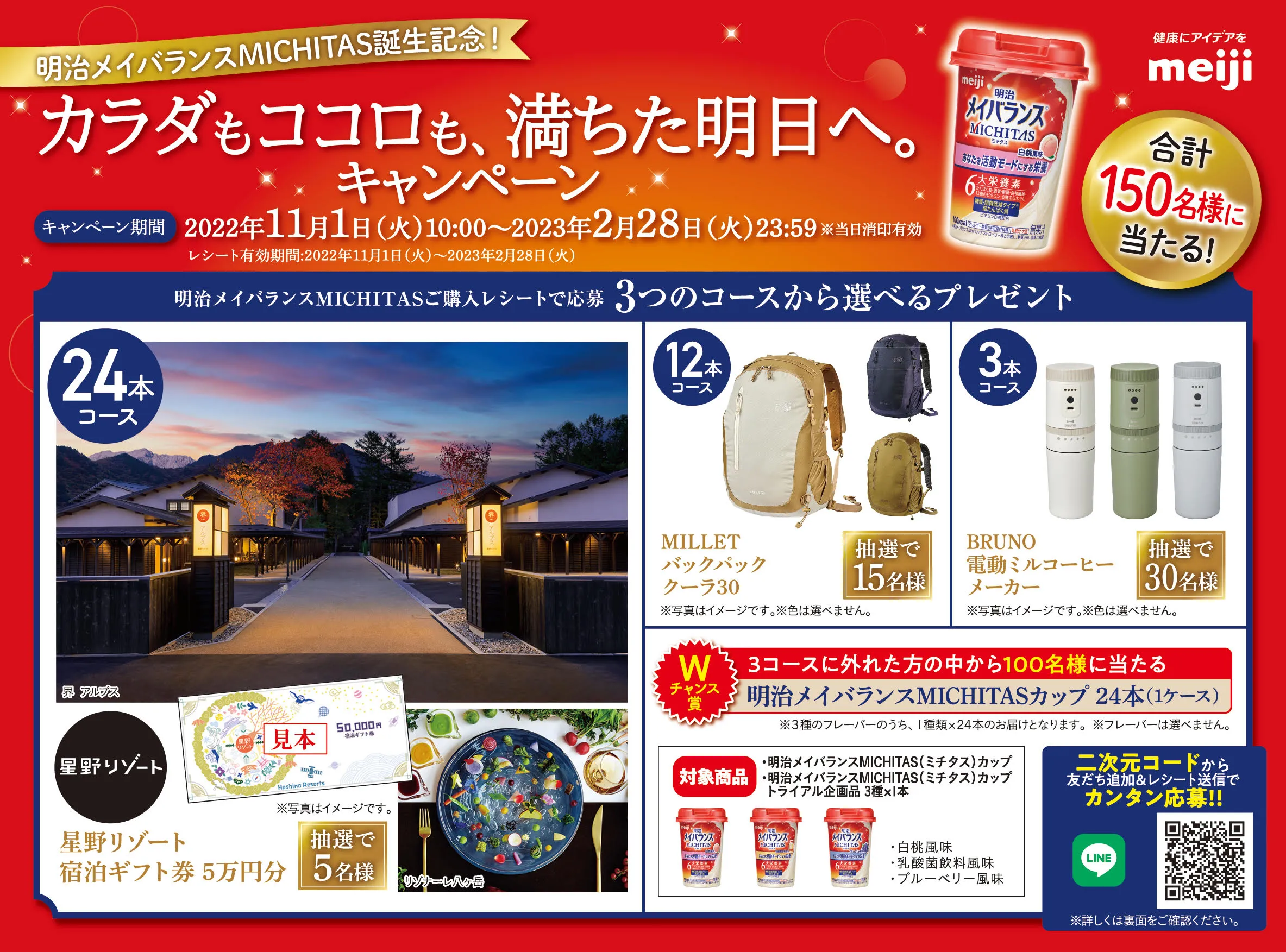 2022年11月1日(火)より、明治メイバランスMICHITAS誕生を記念して「カラダもココロも、満ちた明日へ。」キャンペーンを実施中です。キャンペーン期間中に、対象の明治メイバランスMICHITASカップを各コース必要本数分お買い上げいただいた方の中から抽選で合計150名様に3つのコースから選べる豪華賞品をプレゼント。さらにWチャンス賞として、3つのコースに外れた方の中から100名様に「明治メイバランスMICHITASカップ24本(1ケース)」をプレゼントいたします。