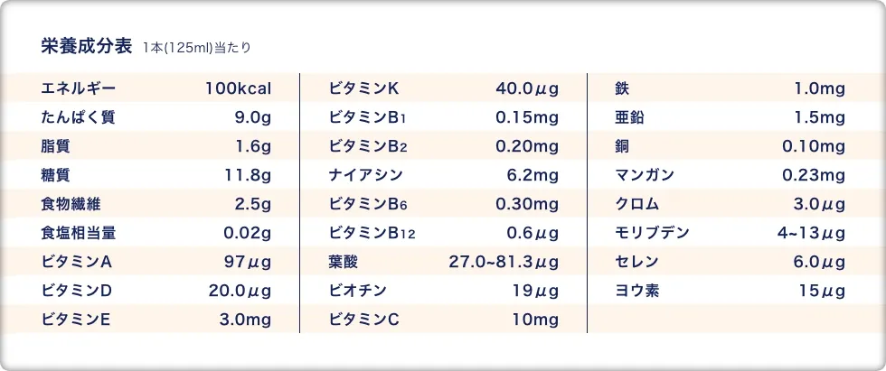 1.6大栄養素(たんぱく質、脂質、糖質、食物繊維、12種のビタミン、8種のミネラル)を配合したトータルバランス設計の飲料