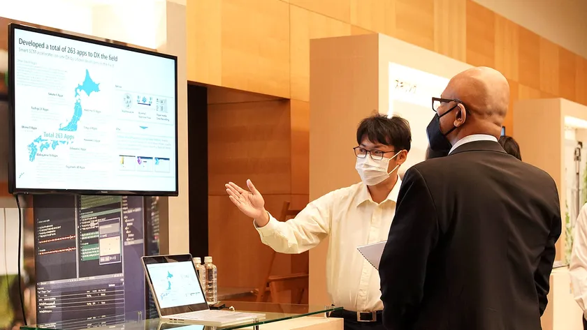 ナデラは、日本国内や世界の人々の生活に変化をもたらすイノベーションを進めている開発者やスタートアップ企業と意見交換しました。例えば、花王株式会社の市民開発プロジェクト( https://news.microsoft.com/ja-jp/features/221116-kao-digitizes-production-sites-with-power-platform/ )の推進者である竹本滋紀氏とは、マイクロソフトのPower Platformを利用したプロジェクトについて話し合いました。現在260以上のアプリケーションが、全国10カ所の工場や事業所で稼働しており、作業スケジュールや検査記録の電子化、生産性向上のための原材料管理といった幅広い業務で活用されています。