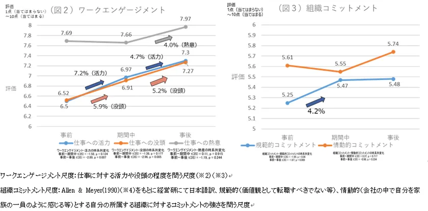 ◆ワークエンゲージメント(仕事への活力・仕事への没頭)が高まり、組織コミットメントも上昇傾向でポジティブな効果が認められた