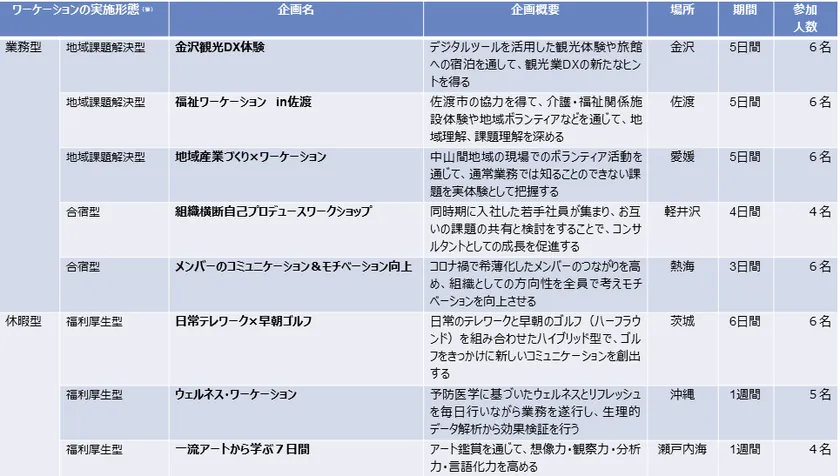 施策発表後、社員から多くの反響があった中で、最終的に、地域関係者と交流しながら地域課題の実態を把握し、課題解決を考える「地域課題解決型ワーケーション」が3グループ、参加メンバーとワークショップや議論を行う「合宿型ワーケーション」が2グループ、リゾート地に滞在し、観光や共通の趣味を楽しみながらリモートワークを行う「休暇型ワーケーション」が3グループ、計8グループの企画が認められ、2022年5月から11月にかけ、コンサルタント、間接部門を問わず、計43名の社員が参加しました。