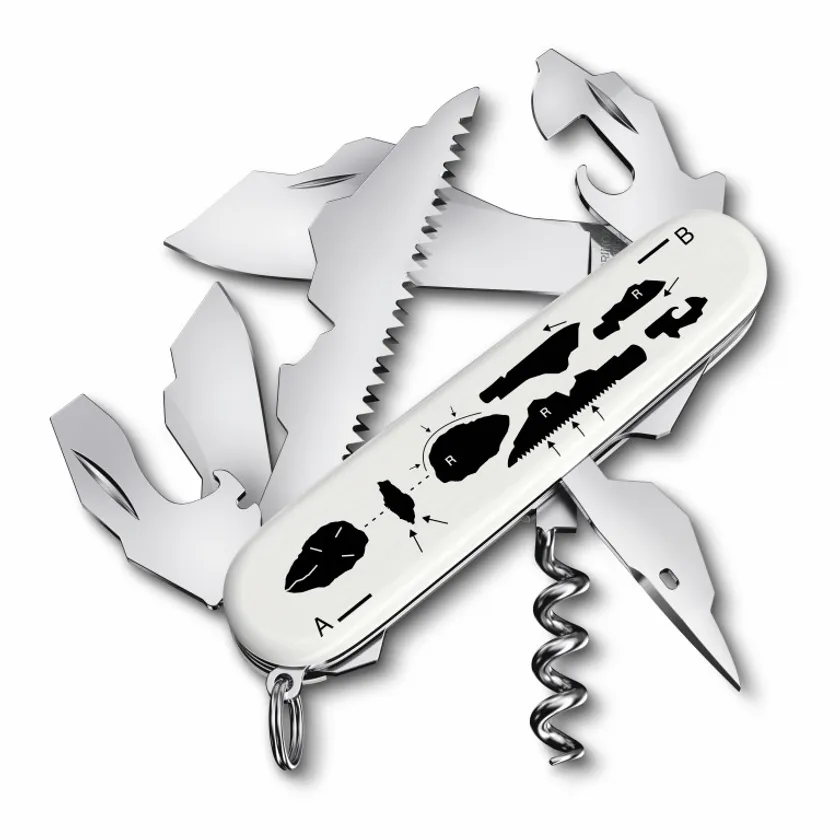 ハンドルはホワイトで、ブラックのプリントがアクセントになっています。ハンドルの表側にはビクトリノックスの伝統を象徴するクロスアンドシールドのロゴがあしらわれ、さらにブランド名と限定モデルの名前と製造年も記されています。ハンドルの裏側には、石からツールへの進化が一連のイメージで表現されています。