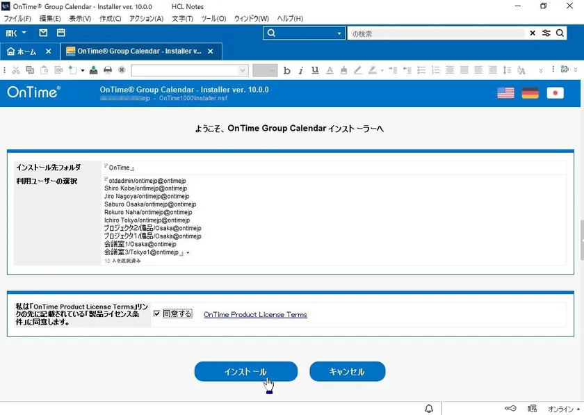 本バージョンで新たに日本語、英語、ドイツ語に対応した簡易インストーラーを実装しました。インストールするフォルダ及び利用するユーザーを指定したあとライセンス条件に同意してインストールボタンをクリックするだけでわずか数分でOnTime for Dominoをご利用いただけます。HCL Domino特有のテンプレートの署名、アプリケーションやグループ文書の作成、タスクやサーブレットのインストールなど面倒な作業を全てインストーラーが実行いたします。