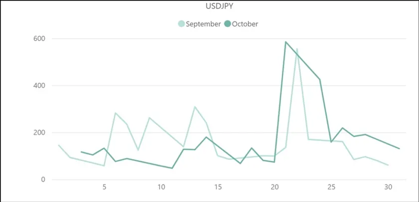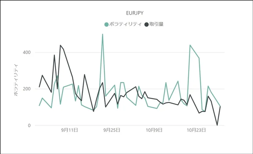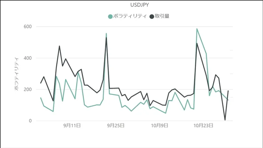 9月・10月のドル円の取引量とボラティリティの推移を示した上記グラフでは、9月に引き続き10月も取引量とボラティリティがしっかりと相関しています。メジャー通貨のドル円は、市場参加者からの関心が高く、取引量の増加と共に相場が大きく動いている可能性が高いです。