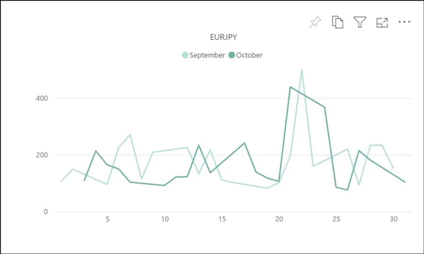 9月・10月のユーロ円(EUR/JPY)のボラティリティ推移を比較した上記グラフから、10月のボラティリティは、9月のボラティリティ推移と近い展開だったことが分かります。ボラティリティが最大を記録したのは、ドル円と同日の10月21日の439.3pipsで、9月22日の499.3pipsに迫ります。