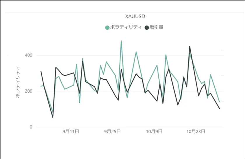 9月・10月共にXAU/USDのボラティリティと取引量は概ね相関しており、取引量が最も減少したタイミングと、最小ボラティリティを記録したタイミングが重なっていることが確認できます。10月の取引量が最大になった21日は、ドル円が151円に突入するも、146円台まで戻る急騰・急落相場でした。