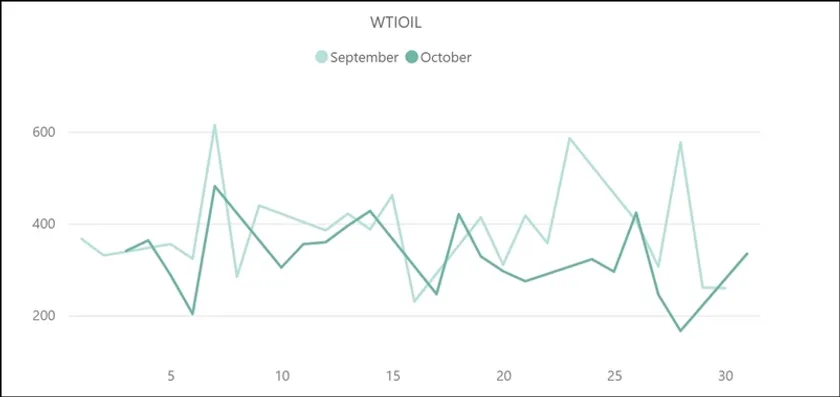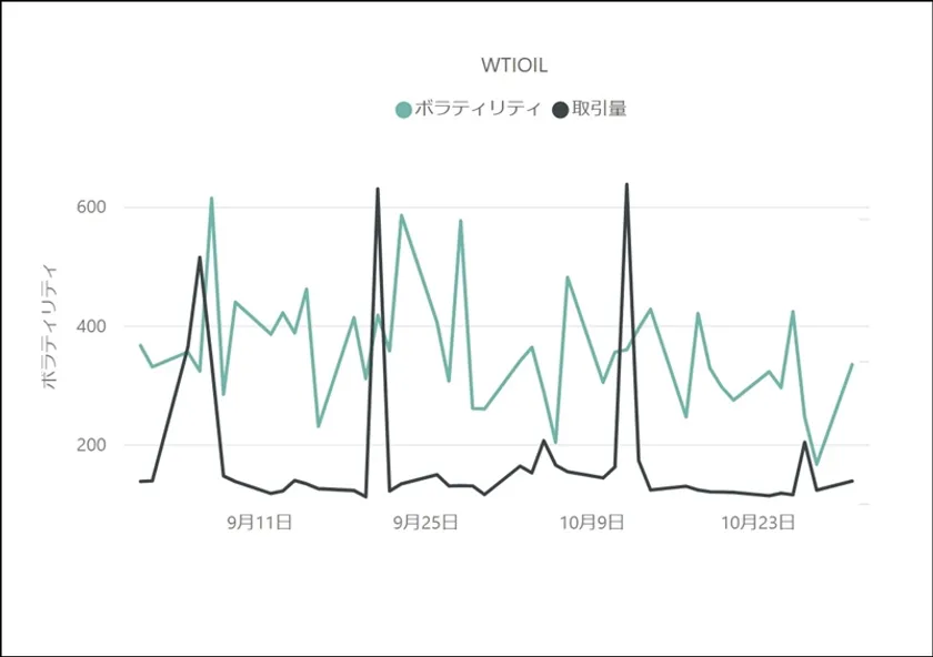 9月・10月のWTIOILの取引量とボラティリティの推移を見ると、取引量に関しては先月と同じく、振れ幅の大きい推移が特徴だ。取引量がごく短い期間だけ上昇するも、持続性がない動きが突発的に発生する傾向が見られます。