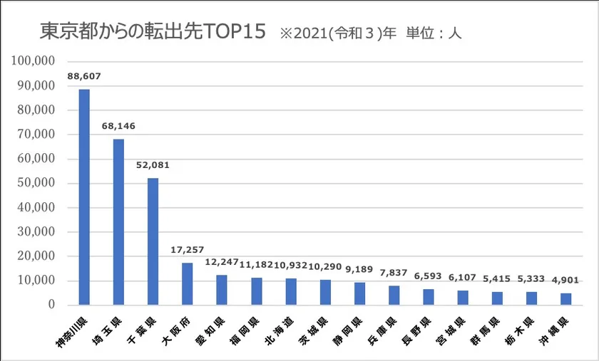 では、転出した人たちはどこに行ったのでしょうか?東京都からの転出先として、最も多かったのは神奈川県、次いで埼玉県、千葉県となっています。近隣3県だけで、実に、転出者全体の55%を占めています。広さや環境など、利便性以外のポイントで住まいを選ぶ人が増えているのかもしれません。(※2)