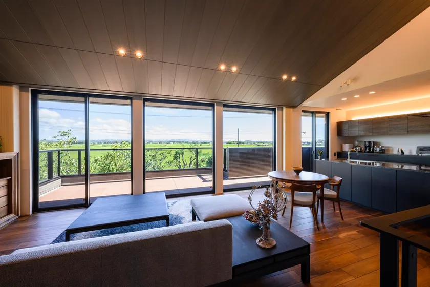 広さにこだわったリビングは、眺望を生かすために2階に。勾配天井を活かした3.7mの天井高と梁や柱のない開放的な空間、そして高さ2.5m、幅約8mの全面開放の窓の先には、青々とした田畑と山並みが絵のように広がります。