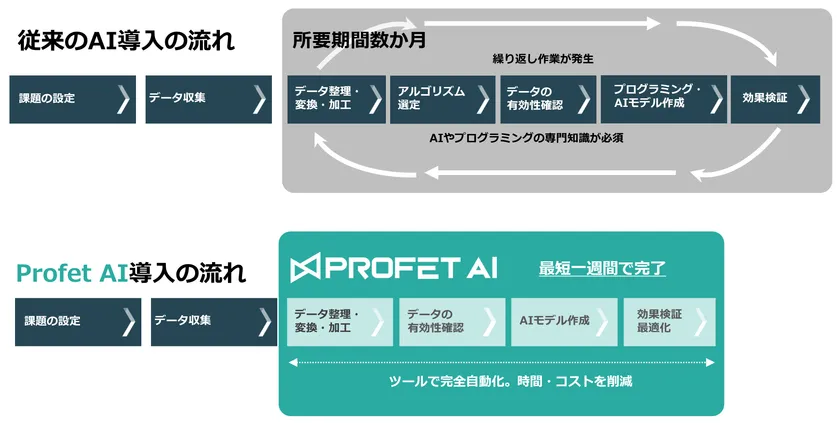Profet AI AutoMLの操作にはプログラミングやAIの専門知識は不要で、操作方法や機能の概要は1日で習得可能です。これまで、データやAIモデルの調整作業は1テーマに対し数か月かかることもありましたが、Profet AI AutoMLでは最短1週間程度でDX化をスタートできるようになります。