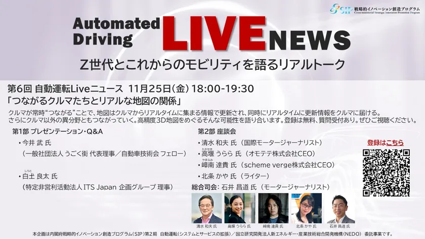 内閣府戦略的イノベーション創造プログラム 第2期 自動運転(SIP-adus)では、自動運転に関するトピックを若い世代と語る「自動運転Liveニュース」の第6回を2022年11月25日にオンラインで開催いたします。