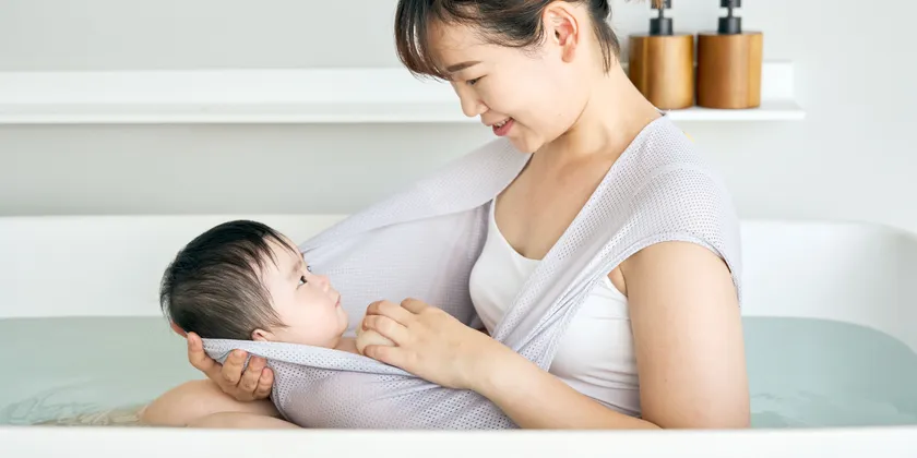 「親子くるむん」は赤ちゃんと常に密着できるように形をスリング状にしました。赤ちゃんの顔を見ながらお風呂に入ることができます。