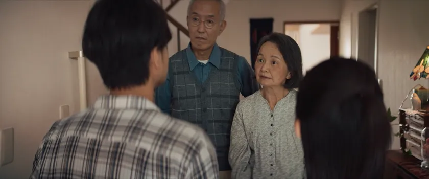 息子に手を振り、見送る笑顔の母と、少し心配顔の父をバックミラーに見て、タクシーに乗りながら息子は何かを考える。