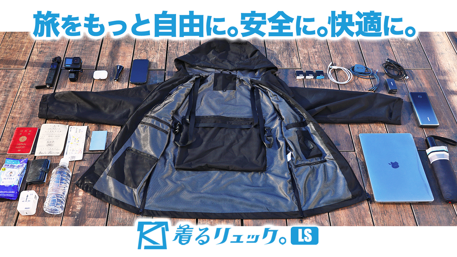 Makuake限定商品の「着るリュックLS。」は、“手ぶら”をコンセプトとして、パソコン、パスポートと旅行に関わる全ての物が収まるように旅する社長YouTuberもーりー様と共同開発いたしました。