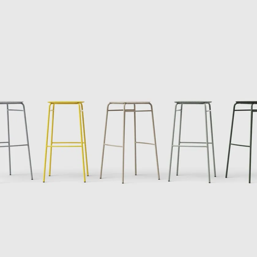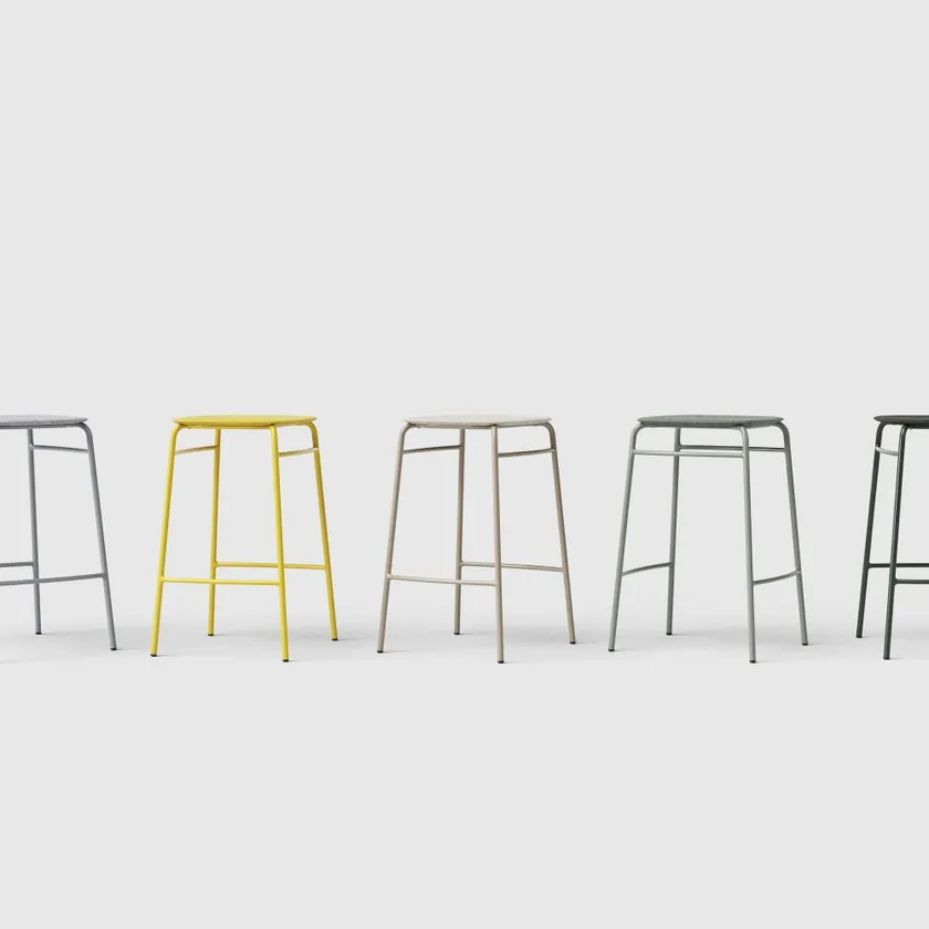 「ツイスト」は環境に配慮したものづくりを探求するデフォルム製品の中で最もリーズナブルで、リサイクルペットボトルから生まれる薄いペットフェルトの座面と細く丈夫なスチールフレームとの組み合わせがよりすっきりとした印象を与える、スツールタイプのシーティングシリーズです。