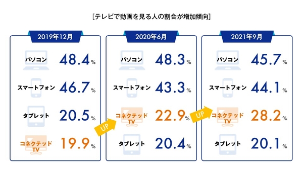 インターネットに接続したテレビ(コネクテッドTV)で動画配信サービスを視聴する割合が2020年6月と比較して5.3ポイント増の28.2%まで増加しました。大画面での視聴に適したスポーツや映画、ドラマ、TVの見逃し配信などの動画配信サービスの利用拡大に伴って、コネクテッドTVは今後ますます定着化していくと想定されます。