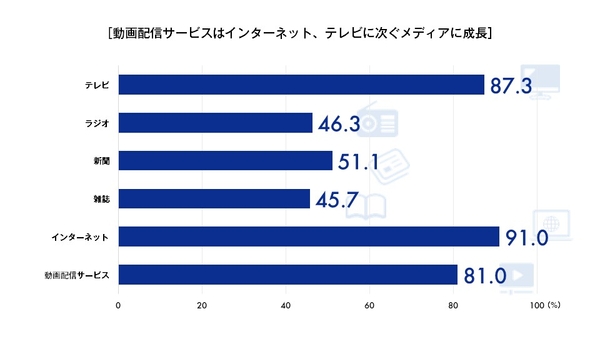 各メディアの利用率は、「インターネット」が最も高く、「テレビ」、「動画配信サービス」が続きました。動画配信サービスは、インターネット、テレビに次ぐメディアへと成長しています。