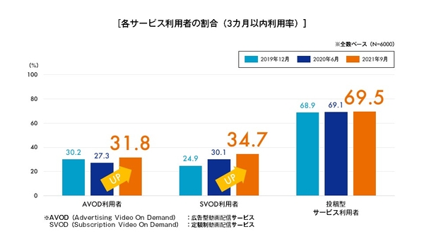 AVOD(広告型動画配信サービス)の利用率は2020年6月と比較して4.5ポイント増の31.8%、SVOD(定額制動画配信サービス)の利用率は4.6ポイント増の34.7%に拡大しました。