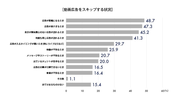 動画広告をスキップしない理由で最も多かった回答は「自分が興味関心のある広告が流れるとき」であり、逆にスキップする理由では「自分が興味関心のない広告が流れるとき」が多くあげられました。