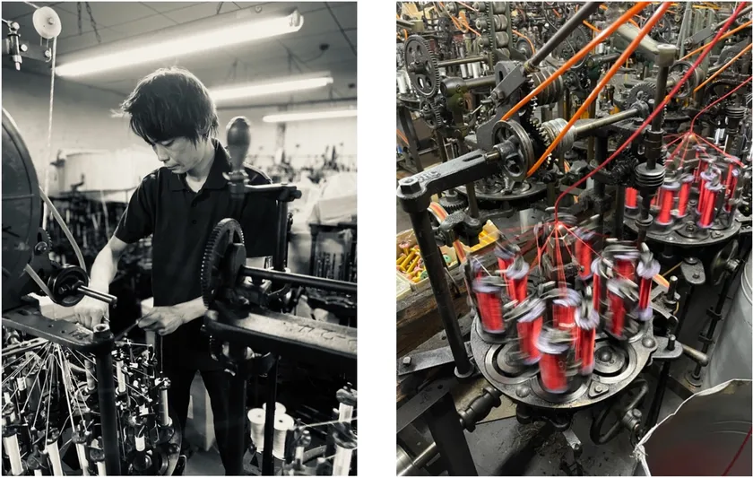 繊維産業が盛んな福井県でもめずらしい製紐(せいちゅう)のメーカーである多田製紐は、福井県勝山の地に1963年に創業しました。現在この工場を仕切っているのは次期3代目となる多田 寛さん。同社工場では常時約400台の昔ながらの製紐機が現役で稼働。京くみひもの流れを汲む製法で紐を作っており、主な用途は、お守りや人形飾り、和菓子の包装の紐などの和の飾り紐を中心に、ブラインドの引き紐などの産業資材があります。