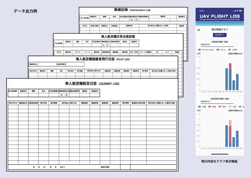 このアプリは飛行年月日・飛行場所・離陸時間・着陸時間・総飛行時間等を入力すれば航空局指定フォーマットに基づいた航空日誌が作成できるほか、飛行前点検のチエックリスト・日常点検表・機体整備記録の作成や操縦者の飛行経歴を記載する「パイロットログ」も作成できます。これらのデータはPDFで印刷はもちろん、LINEやメールで共有することも可能です。他にもUAVが訓練・物流・点検など各用途別利用状況がグラフで確認できる機能や、所有者の技能証明や保険の有効期限を事前に知らせて更新を忘れないようにする機能も備えており、全国のUAVユーザーの方や各スクール・警察・消防・自治体にも「UAV flight Logアプリ」を有効活用して運航管理をしていただけるよう推奨しながらUAVの安全運航に寄与していきたいと思います。
