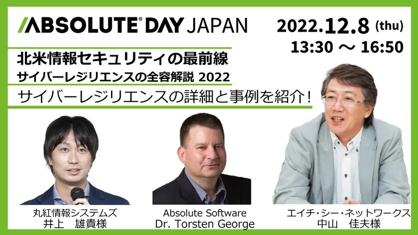 Absolute Software株式会社は、2022年12月8日(木)13:30から、組織のIT担当者およびセキュリティ担当者向けに、北米サイバーレジリエンスの最前線を解説するとともに具体的なソリューションを紹介し、さらに日本国内での導入事例を紹介する無料オンラインセミナー「ABSOLUTE DAY JAPAN 2022」を実施します。