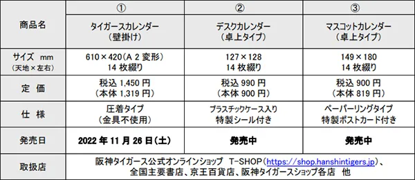 通信販売でのご注文は、阪神タイガース公式オンラインショップT-SHOP( https://shop.hanshintigers.jp/ )及び阪神タイガースカレンダー事務局( https://hcl-c.com/shop/calendar2023/ )で随時受け付けております。