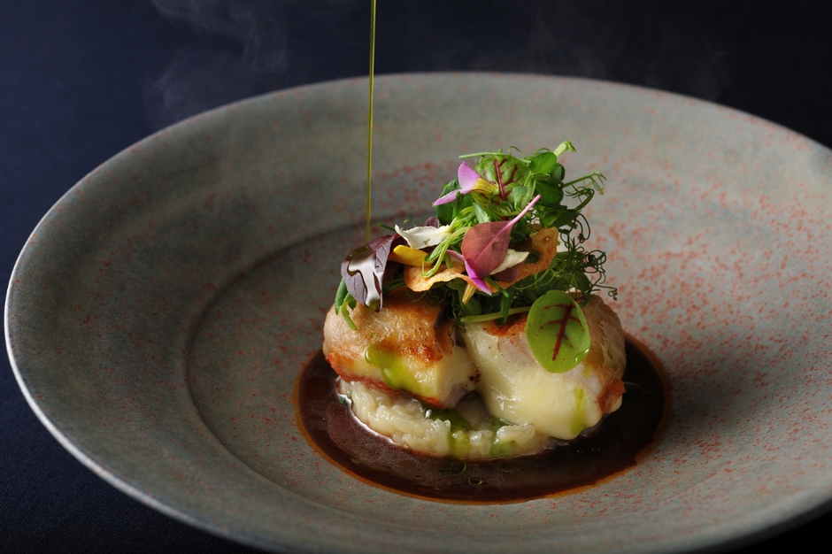 メイン料理は朴葉に包み込み焼き上げた牛フィレ肉のグリルです。味噌でマリネし、じっくり漬け込んだ牛肉に合わせるのは、素揚げした芽キャベツ、高温でローストした黄色人参、スチームしたゆり根など冬に旬を迎えるさまざまな野菜です。朴葉の優しい香りと共に、芽キャベツのほろ苦さや人参の甘味、噛むたびに溢れる牛肉の旨みを堪能できます。