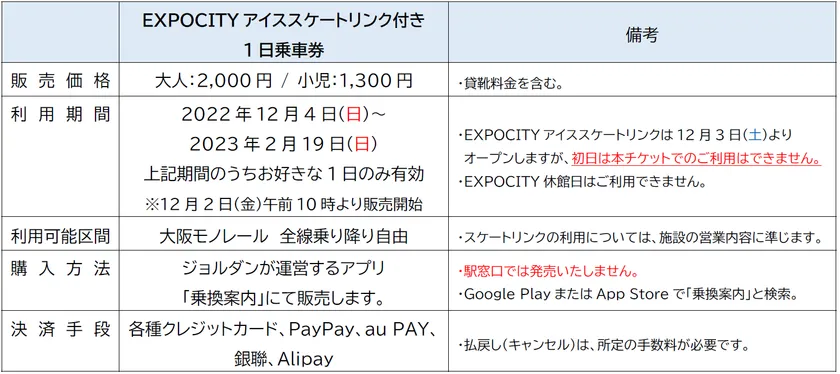 大阪モノレール株式会社(本社:大阪府吹田市、代表取締役社長:森岡 武一、以下、大阪モノレール)と、ジョルダン株式会社(本社:東京都新宿区、代表取締役社長:佐藤 俊和、以下、ジョルダン)は、12月2日(金)午前10時より、大阪モノレールの1日乗車券とEXPOCITYにて開設される期間限定のアイススケートリンク(主催:株式会社シーキュー・アメニック)の入場券をセットにした、「EXPOCITYアイススケートリンク付き1日乗車券」をモバイルチケットとして発売します。