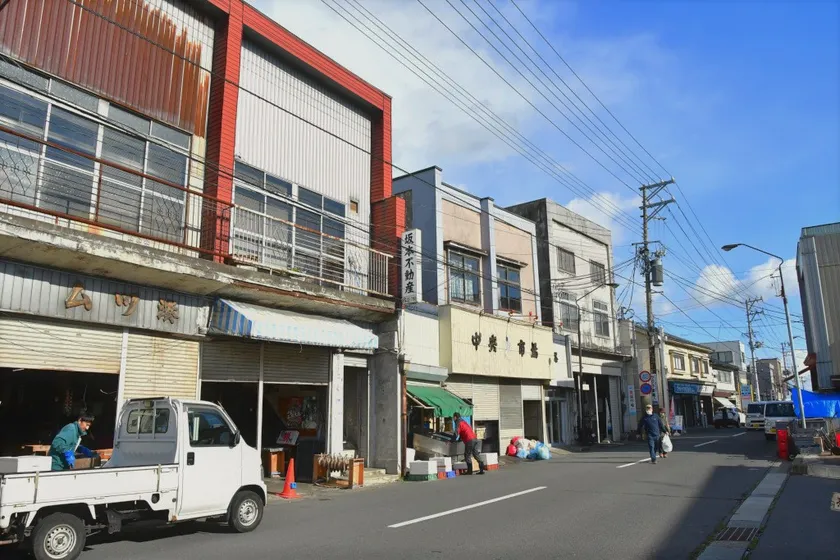 市場の中だけでなく、陸奥湊駅前通りの景観も魅力の一つです。昔ながらの雰囲気漂うお店が連なる陸奥湊駅前通りが、昇る朝日に染まっていく様子は趣があります。