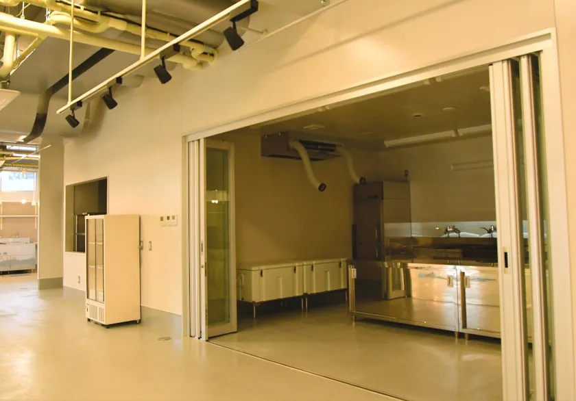 市場の真ん中に位置する食堂の横には、厨房さながらの調理器具を備えた「キッチンスタジオ兼調理室」が設けられています。魚の解体ショーや料理教室等、あらゆる人が使用できるよう広々とした内部と、それを囲うスライド式ガラス扉などオープンな設計が特徴です。