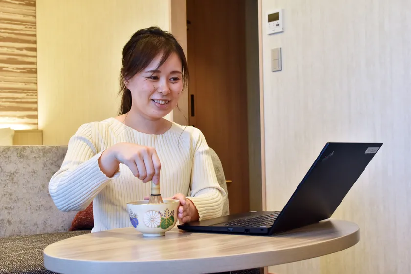 ご自宅で気軽にご受講いただけるオンライン研修(Zoom)。事前にお抹茶セットを郵送いたします。親子参加も大歓迎です。