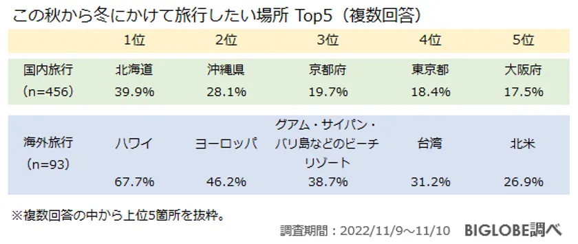 この旅行意欲のある467人に「この秋から冬にかけて旅行したい場所」を複数回答で質問したところ、国内旅行では北海道、海外旅行ではハワイが1位であった。