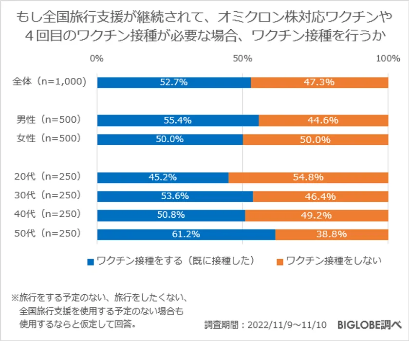 また「もし全国旅行支援が継続されて、オミクロン株対応ワクチンや4回目のワクチン接種が必要な場合、ワクチン接種を行うか」と質問したところ、全体の52.7%が「ワクチン接種をする(既に接種した)と回答した。「ワクチン接種をする(既に接種した)」と回答した割合が一番低いのは20代で45.2%、一番高い割合は50代で61.2%となり、16%の開きがあった。