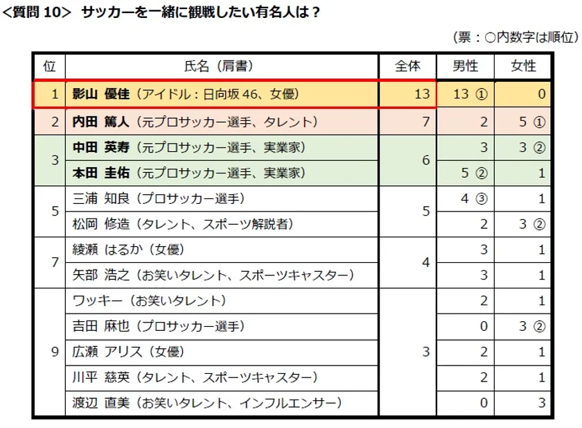 結果は、“アイドル界ナンバー1のサッカー通”として知られる大のサッカー好きの女優・アイドル 日向坂46メンバーの「影山優佳」さんが、サッカー元日本代表や現役選手の面々を抑えて1位となりました。