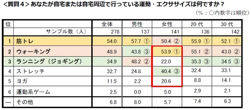 ◆トップ3は「筋トレ」、「ウォーキング」、「ランニング」女性では「ストレッチ」、「ヨガ」も