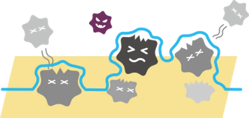 【ポリヘキサメチレンビグアナイド】は、菌を包み込み無酸素状態にして除菌します。