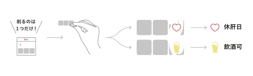 日めくりカレンダーのように、3箇所あるスクラッチのうち1箇所だけを削り、出てきたイラストによって、その日に飲めるかどうかが決まる、緩やかに楽しみながら健康に配慮できるカレンダーです。