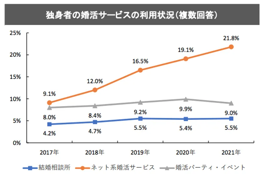 近年、市場規模が急拡大しているマッチングアプリ。コロナ禍で婚活パーティーや合コンなどイベントが軒並み減少する中、マッチングアプリは利用者が増加し続けています(下記グラフ1参照)。