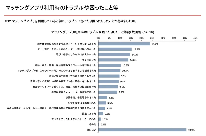 三菱UFJリサーチ&コンサルティングによる「マッチングアプリの利用状況に関するアンケート調査 2021年12月23日」のトラブル例で「交際や婚姻の状況を詐称された」と10%が回答していることがうかがえます(下記グラフ2参照)。