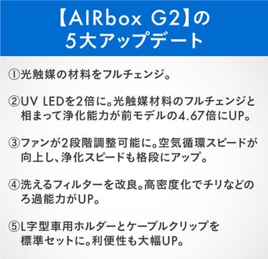 最新モデル「AIRbox G2(エアーボックス ジーツー)」は置き場所に悩まない手のひらサイズのまま、前作のAIRboxを4.67倍パワーアップした高性能を実現いたしました。